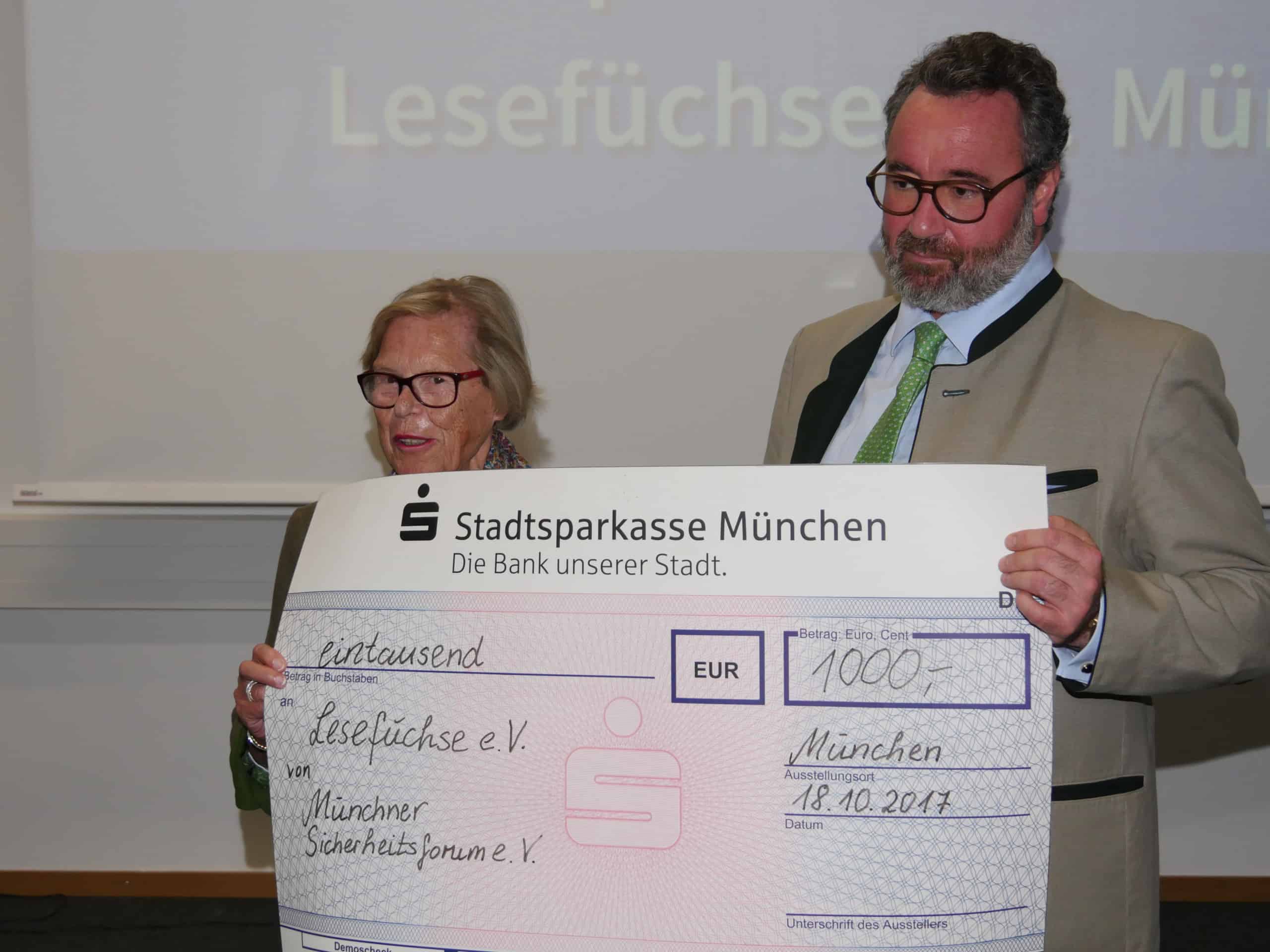 Das Münchner Sicherheitsforum, das die gemeinsame Vorlesearbeit schon länger beobachtet, nahm den Empfang zum Anlass, den Lesefüchsen einen Scheck mit einer Spende über 1.000 Euro zu überreichen. Zwei kurze Filme zeigten den Besuchern des Empfangs, einerseits wie so eine Lesestunde mit der Polizei abläuft. Lesefuchs Peter Schönwälder war bei einem Termin in der Implerschule mit dabei und interviewte Lehrer, Polizistinnen und Schüler. Und vom Lesefest bei der Bereitschaftspolizei wurde von Polizeikollegen ein Film gezeigt, der sehr schön die Auftritte der Hundestaffel, der berittenen Polizei zeigte, die Fotosession für alle auf dem Polizeimotorrad sowie den berühmten Polizeikasper.