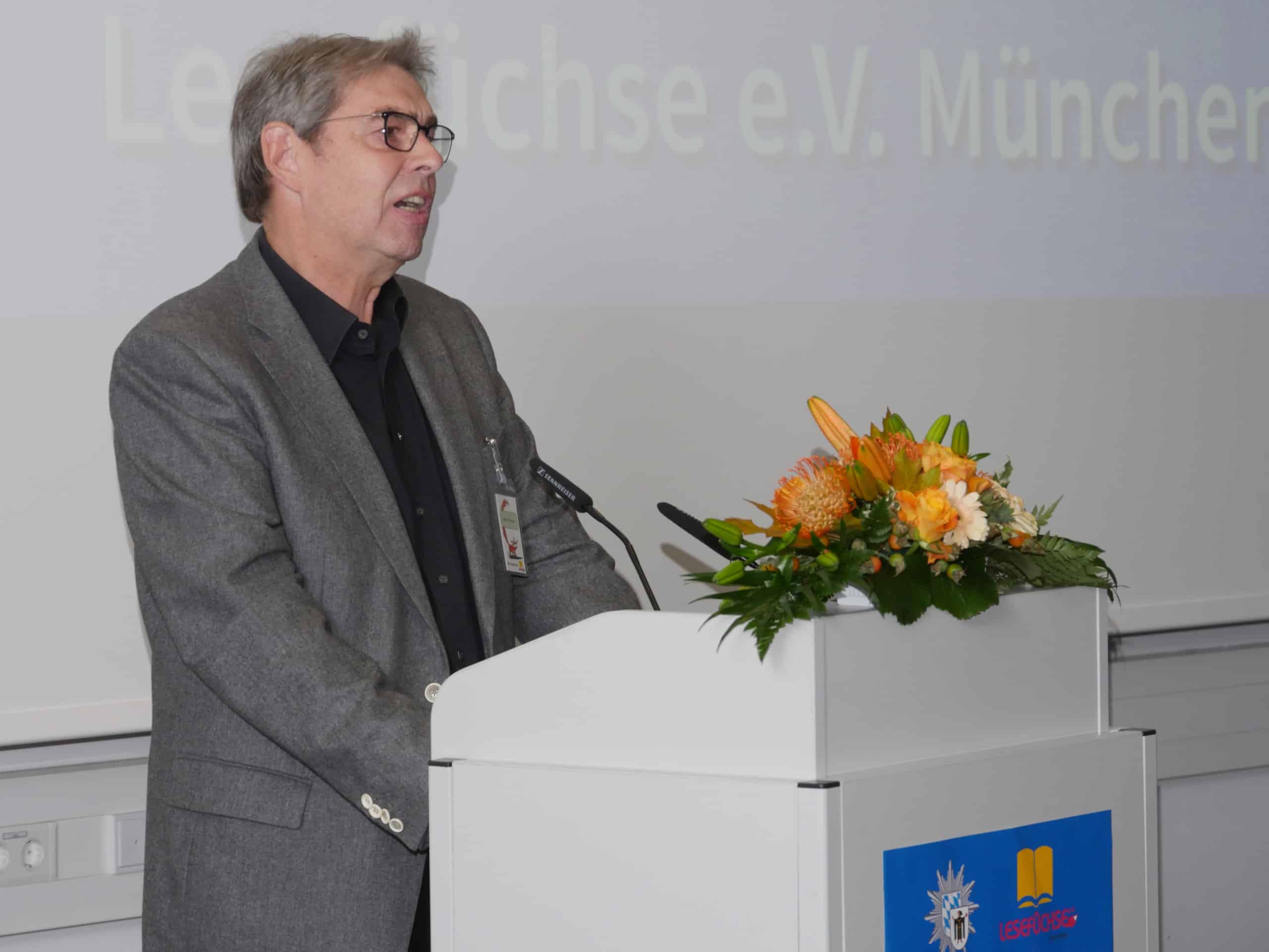 Hans Wanger, Vorsitzender der Lesefüchse, erinnerte an die Vereinsgründerin Helga Wolf. Sie wollte Polizeibeamte nicht als Autoritätspersonen, sondern als Geschichtenerzähler erleben. Das Vertrauen der Kinder zur Polizei wollte sie fördern und die Kinder ermuntern, sich bei Problemen an Kontaktbeamte ihres Stadtteils zu wenden. Im März 2007 wurden an 33 Orten unter großer Medienbeobachtung das erste Mal von fast 90 uniformierten Beamten vorgelesen. Alle Beteiligten waren so begeistert, dass daraus die dauerhafte Kooperation Lesefüchse und Polizei wurde. In den Folgejahren erhielten wir weitere Auszeichnungen: Münchner Lichtblicke 2007” sowie “Aktiv für Demokratie und Toleranz” in 2008. Er freue sich bereits auf das nächste gemeinsame Jubiläum im Jahr 2027, schmunzelte Wanger.