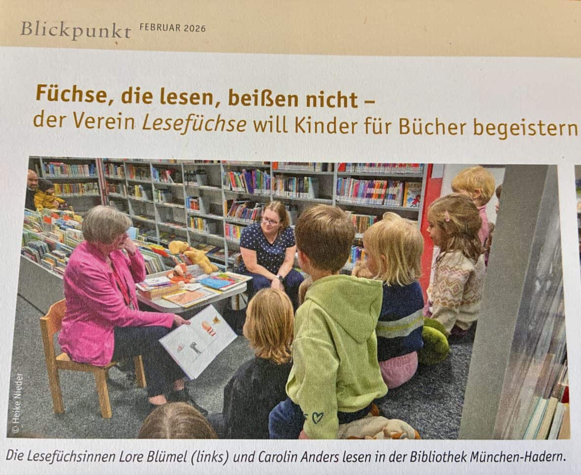 Für die aktuelle Februar-Ausgabe hat Chefredakteurin Heike Nieder das Lesefüchse-Team in der Stadtbibliothek Hadern vor Ort besucht und über unsere Basis der Leseförderung, unsere Vorlesestunde berichtet. Entstanden ist ein gelungenes Portrait über die Arbeit von uns Lesefüchsen und unserem Kooperationspartner, der Münchner Stadtbibliothek. Gezeigt wird auch, wie essenziell und wichtig das dialogische Vorlesen für die sprachliche Entwicklung von Kindern ist.